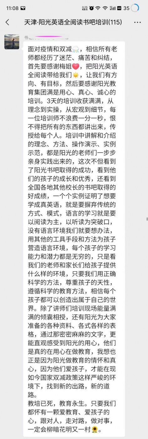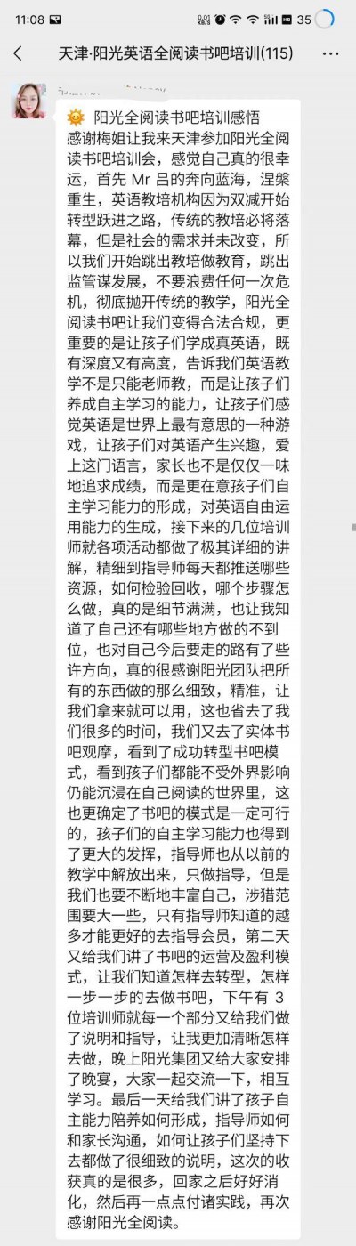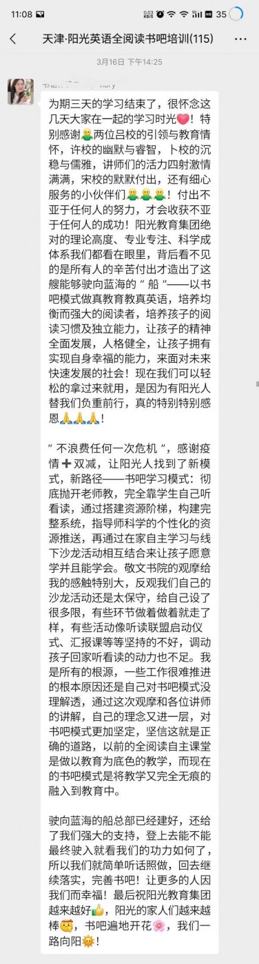 陽(yáng)光書(shū)吧指導(dǎo)師集訓(xùn)營(yíng)全程干貨滿(mǎn)滿(mǎn),從理論到實(shí)操,到現(xiàn)場(chǎng)觀摩天津敬文書(shū)苑,加之天津敬文書(shū)店唐館長(zhǎng)及西安格致書(shū)吧賈館長(zhǎng)的書(shū)吧升級(jí)經(jīng)驗(yàn)及成果分享,讓全體與會(huì)者看到了一個(gè)實(shí)實(shí)在在的合法合規(guī)的能學(xué)成真英語(yǔ)的書(shū)吧,與會(huì)者高度認(rèn)可陽(yáng)光英語(yǔ)全閱讀書(shū)吧模式。