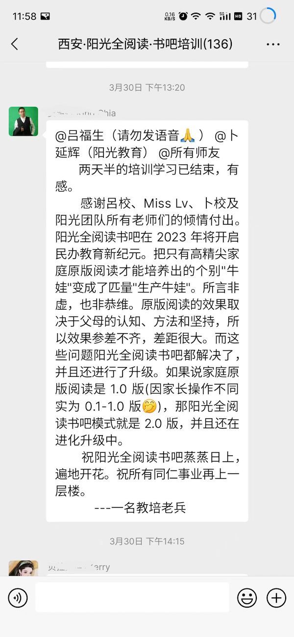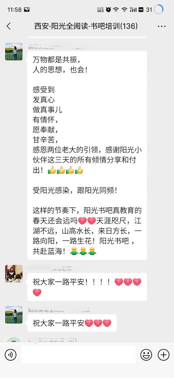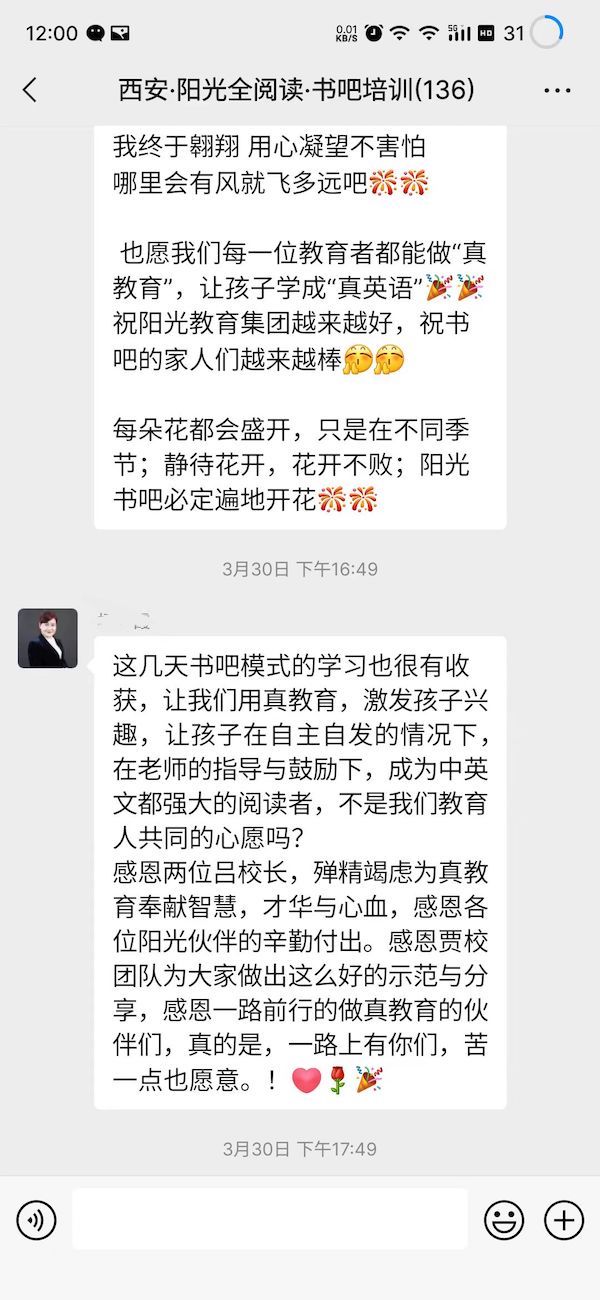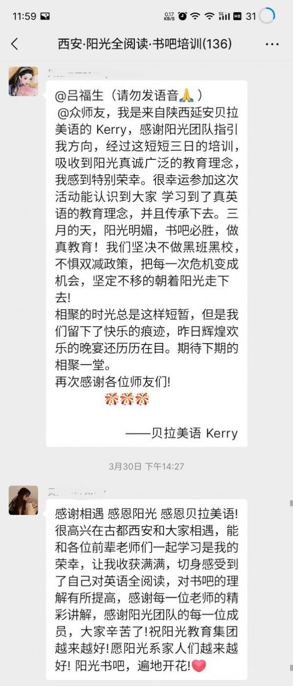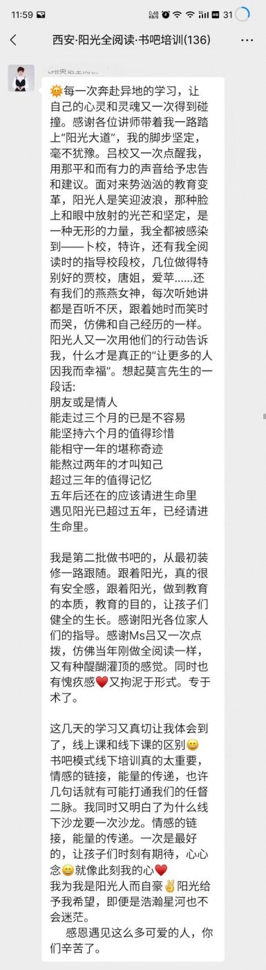 陽光書吧指導(dǎo)師集訓(xùn)營全程干貨滿滿,從理論到實(shí)操,到現(xiàn)場觀摩西安格致書吧,加之西安格致書吧賈館長、天津敬文書店唐館長、長春悅享時(shí)光書吧張館長及鄭州聞鹿鳴書店金館長的書吧升級經(jīng)驗(yàn)及成果分享,讓全體與會(huì)者看到了一個(gè)實(shí)實(shí)在在的合法合規(guī)的能學(xué)成真英語的書吧,與會(huì)者高度認(rèn)可陽光英語全閱讀書吧模式。